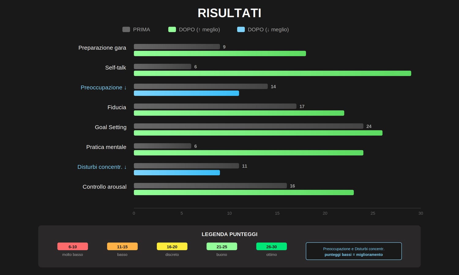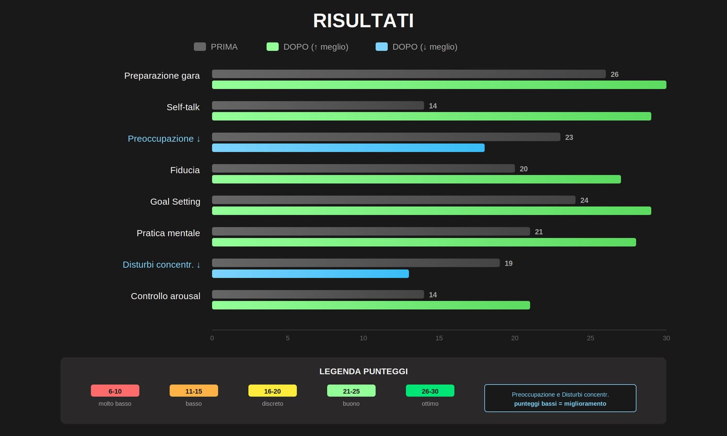Self-talk, fiducia, gestione della pressione, pratica mentale... ogni parametro migliora.